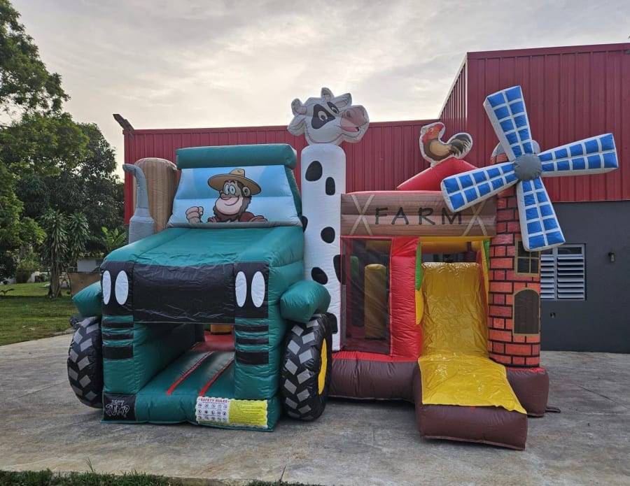 El inflable “La Granja” es una atracción encantadora y llena de color, perfecta para los más pequeños. Con un diseño que incluye un tractor, vaca, molino de viento y un simpático granjero, este inflable recrea el ambiente alegre del campo y garantiza horas de diversión segura y educativa.